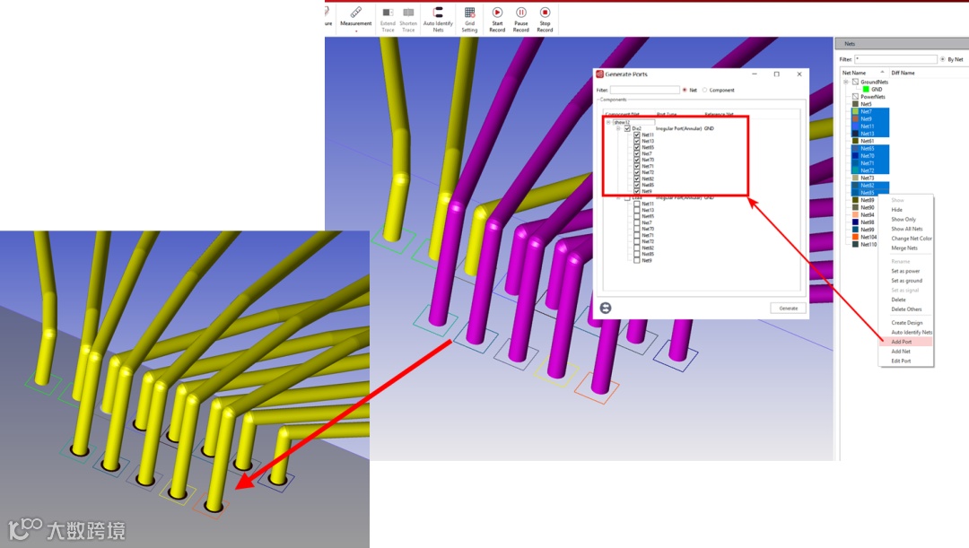 选中要仿真的网络,右键对Die部分网络进行环形端口的添加。