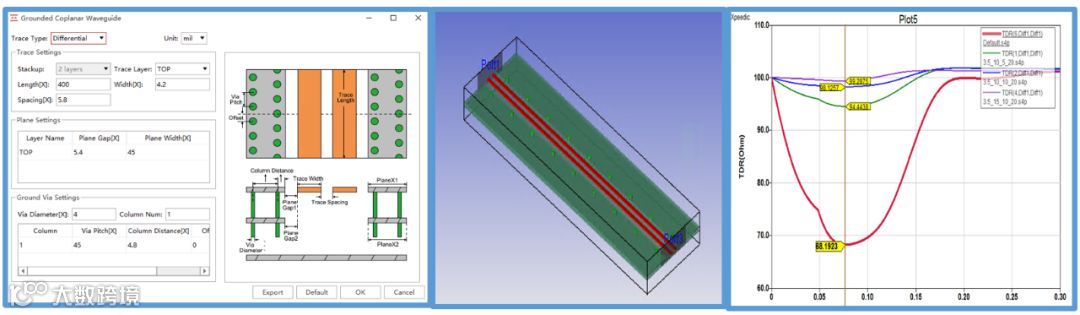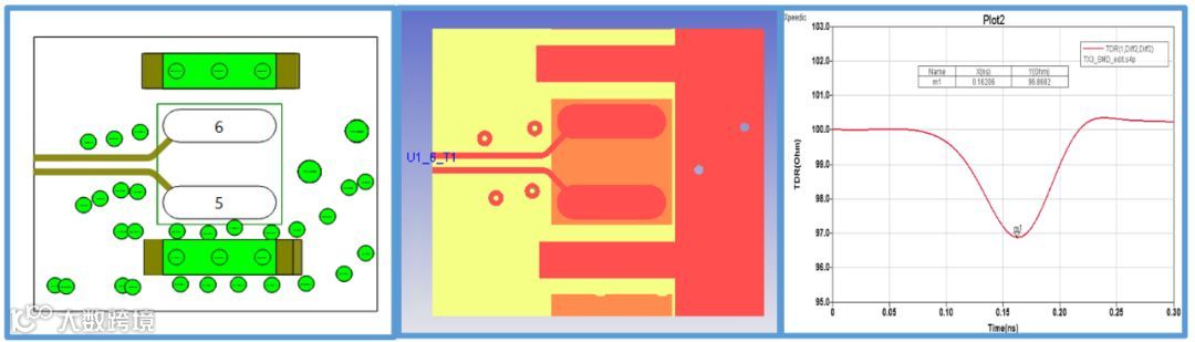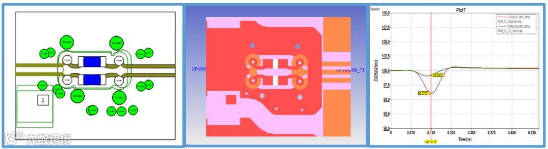在ViaExpert中,对于电容模型,软件支持在2D界面添加集总的RLC参数。图6是电容处FootPrint、3D模型及结果对比。TDR结果对比中,红色是原始挖空区域的结果,绿色是多挖空一层相邻层的结果,由此可看出,通过多挖空一层相邻层就可以改善阻抗,使其达到目标阻抗100Ohm的要求。