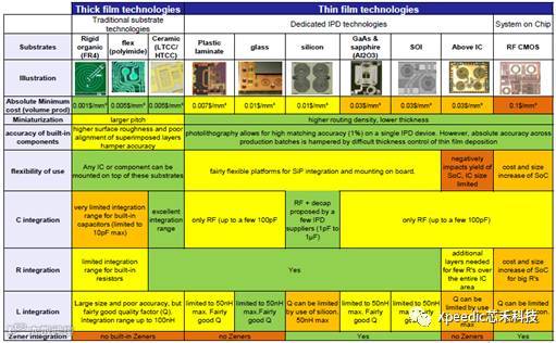 一般来说,根据无源器件制作工艺的不同,IPD技术分为厚膜技术与薄膜技术。低温共烧陶瓷(LTCC)是典型的厚膜IPD技术,过去被广泛应用于民用通信、军用电子中。然而,陶瓷基板烧结时收缩严重,难以满足目前技术对高精度的要求,且厚膜工艺线宽为几十微米两级,集成度有待提高。而薄膜技术具有集成度高、体积小和重量轻的特点,且能够为IPD技术提供最优良的器件精度和功能密度。因此,厚膜技术正逐渐被薄膜技术所取代,成为主流的IPD技术,我们通常所说的IPD即是指薄膜技术IPD。特别是硅基IPD技术,因其具有价格低、导热性能良好、以及与传统硅集成电路工艺相兼容等优点,使得它逐渐成为SiP中无源系统小型化的首选解决方案。