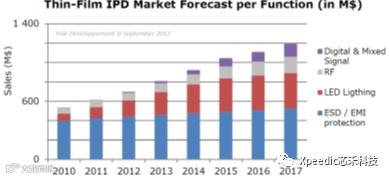 由IPD如上三方面的功能可以看出,其应用领域几乎囊括了所有电子系统,特别是移动领域的应用。据知名市场调研公司Yole Development统计,全球无源器件需求总量超过330亿美元。从2008年开始,薄膜IPD的全球销售额就超过6亿美元,预计2017年市场将超过12亿美元。由此可见,IPD的市场空间和潜力不可估量。集成无源器件是国际上炽手可热的技术,据报道,PA的国际龙头企业Skyworks所用方案中多采用IPD技术,每月所需IPD晶圆达到数千张,且增长趋势明显。国内方面,在芯禾科技先进IPD设计技术引领下,国内各大芯片设计巨头都在积极将此技术布局于高端芯片设计,把IPD无源芯片与有源芯片整合在SiP模组中,采用三维封装集成方式,进一步实现小型化。