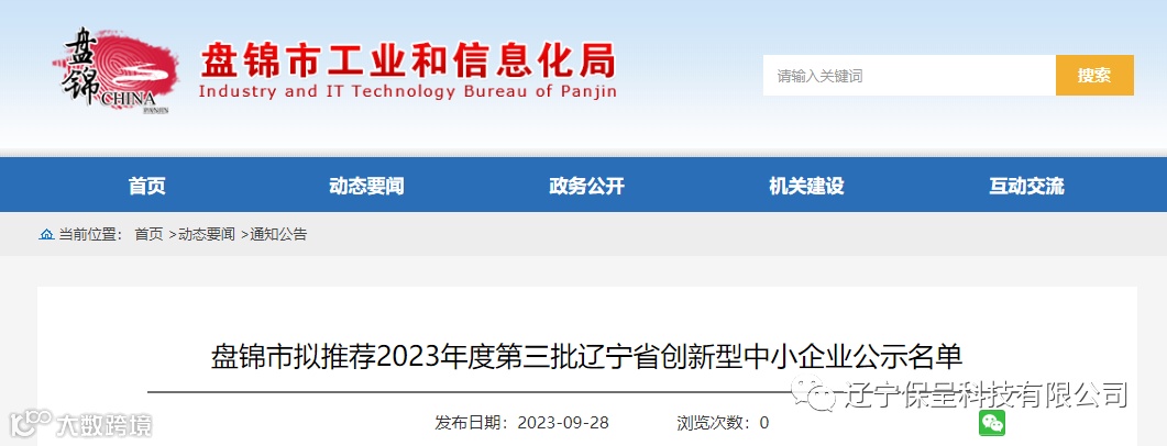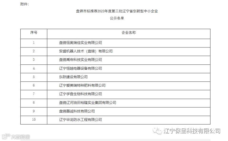 保呈快讯内容:关于《盘锦市拟推荐2023年度第三批辽宁省创新型中小企业公示名单》-内容分享