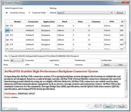Via Expert中自带了很多业界当前正在使用的高速连接器Footprint模型,如果没有所需要的,可以在现有连接器Footprint模型的基础上进行修改,然后另存为连接器Footprint模型库文件。在图8中选择所需的连接器名,点击Next按钮,就会弹出该连接器的Footprint模型,如图9所示。