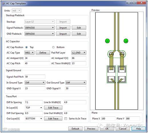 10Gbps及以下速率的高速Serdes链路上通常都会带有AC耦合电容,起到隔离直流电平的作用。在大部分EDA仿真工具中,AC耦合电容部分都需要由仿真人员手动建模。这不仅耗时耗力,而且对于初学者而言,很难一次性建出正确的模型。类似于BGA Via建模,ViaExpert软件也提供了AC Cap建模Template。在图3界面中选择ModelWith AC Cap模板,就会弹出图7所示的ACCap建模向导。为了便于给模型添加仿真端口,在图7所示的ACCap模型中包括了电容焊盘上的引出走线,以及引出走线对应的Fanout过孔。