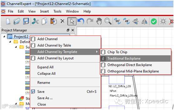 与ViaExpert一样,在Channel Expert中针对不同的通道链路类型,也开发了对应的通道建模Template。如图13所示,在AddChannel by Template菜单下有四种类型的通道链路建模Template。对于单板内部芯片与芯片之间互连的高速链路,可以选用Chip to Chip Template;对于传统背板链路,可以选用Traditional BackplaneTemplate;对于正交直连的背板链路,可以选用Orthogonal Direct Backplane Template;对于带中置背板的正交背板链路,可以选用OrthogonalMid-Plane Backplane Template。
