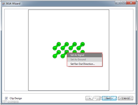 完成参数设置之后,点击图4中的Next按钮,进入图5所示的BGAVia建模向导界面。由于在图4界面中设置所有过孔均为地孔,因此需要在图5界面中选中部分地孔,通过鼠标右键菜单将其属性更改为信号孔。完成这一设置后,再点击Next按钮,对BGA Via模型进行必要的切割。之后点击Finish按钮,软件就会自动建出图6所示的BGAVia过孔模型。