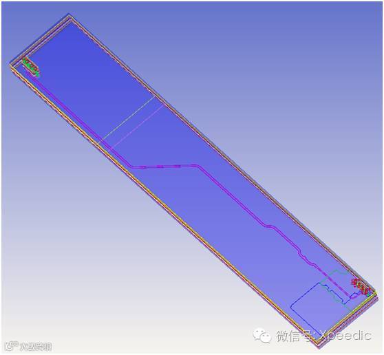 要的走线、信号孔保留下来,去除不必要的成分,得到图25所示的实际走线拓扑的三维模型。在提取的实际走线拓扑两端的信号孔或Pad上加上端口,设置好仿真频段,就可以在ViaExpert中进行仿真,最终得到实际走线拓扑的S参数。