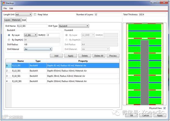 当信号速率较高时,对于各种孔的模型都会有背钻的要求。Via Expert软件对于信号孔的背钻提供了非常方便的设置功能。
