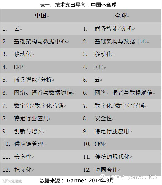 中国的CIO们关注云、基础架构与数据中心,ERP以及网络、语音与数据通信,从而确保基本IT功能得以适用。他们同时也关注移动化,大数据,数字化营销以及社交化,通过这些来吸引客户和员工。中国对“云”情有独钟,或许是因为“云”可以反映出增长的驱动力以及对更大量事务处理支持的需求。