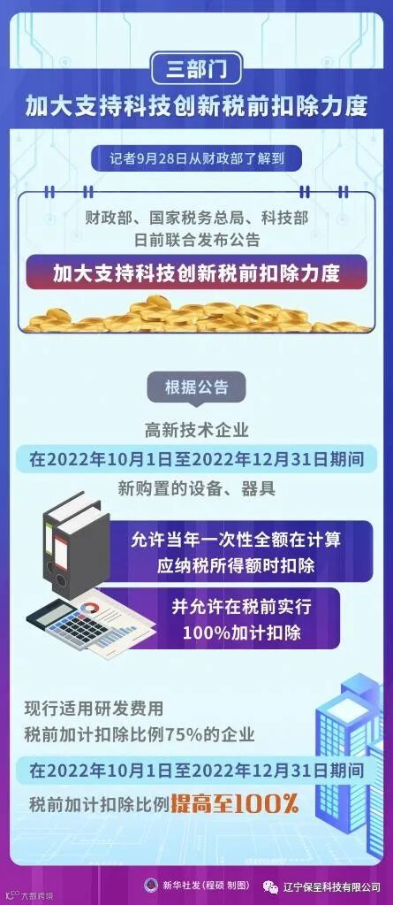 根据公告,高新技术企业在2022年10月1日至2022年12月31日期间新购置的设备、器具,允许当年一次性全额在计算应纳税所得额时扣除,并允许在税前实行100%加计扣除。现行适用研发费用税前加计扣除比例75%的企业,在2022年10月1日至2022年12月31日期间,税前加计扣除比例提高至100%。