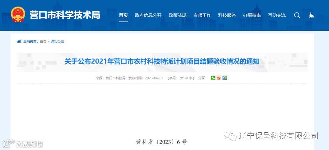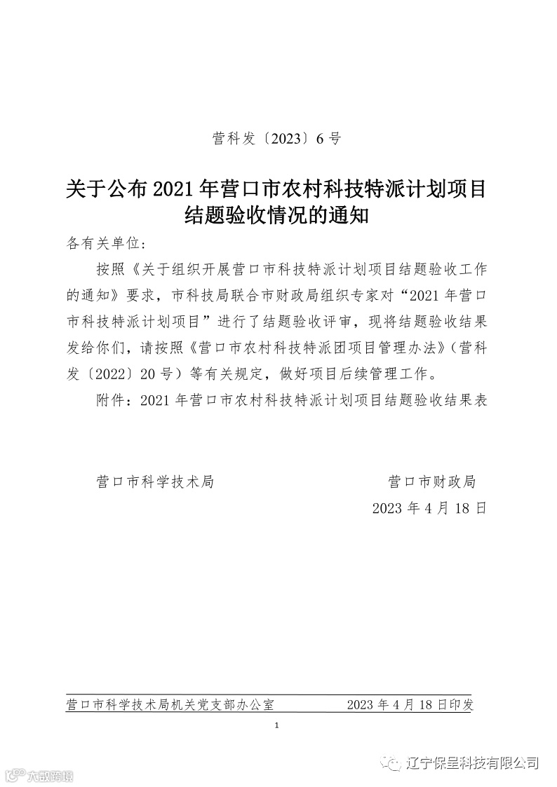 本期保呈-快讯内容:关于《关于公布2021年营口市农村科技特派计划项目结题验收情况的通知》-内容分享