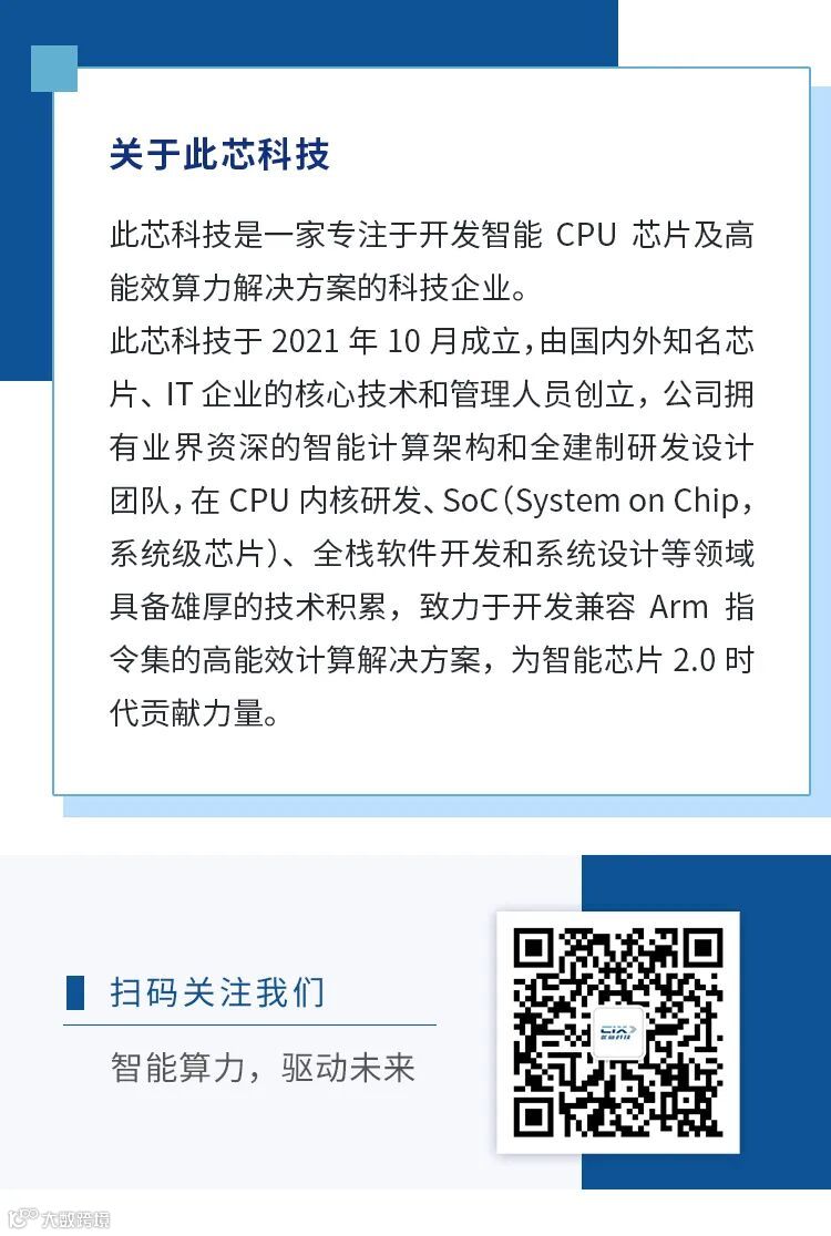 自2021年成立起,此芯科技一直专注于Arm CPU赛道,致力于为社会提供低功耗智能算力解决方案。采用新一代多核异构的方式,此芯科技在研的首款芯片将通过先进架构的CPU设计提供更高效的通用计算能力,满足不同应用场景的算力需求。