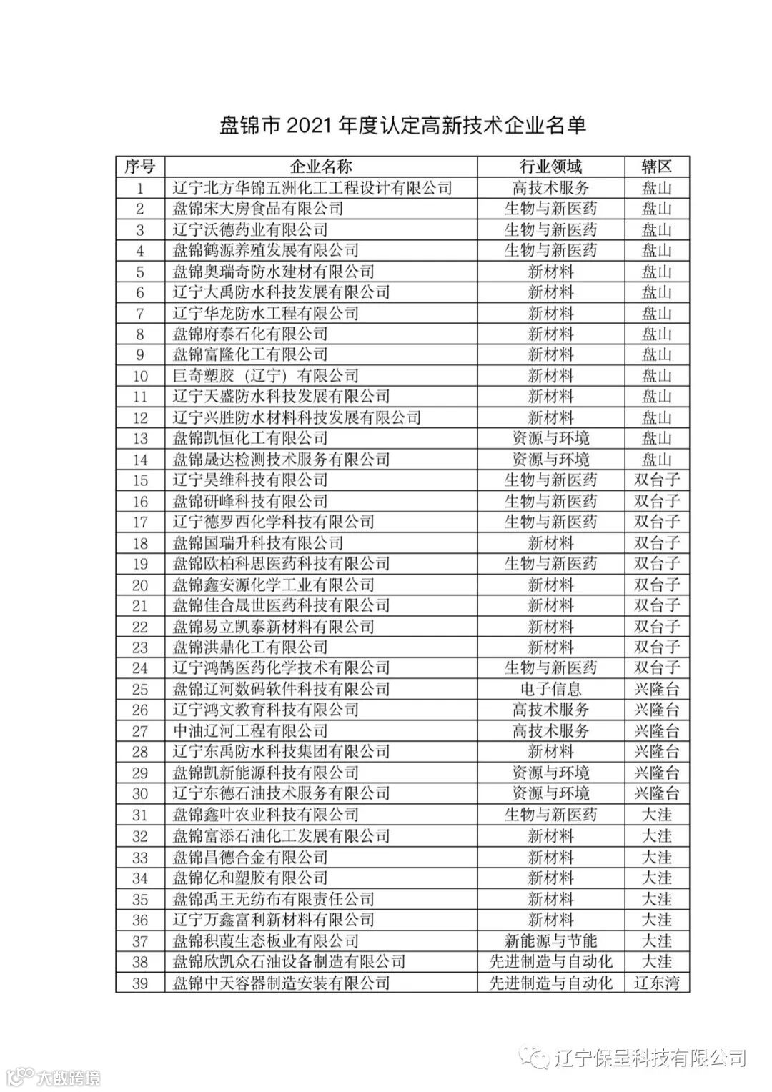本期保呈快讯内容:关于《盘锦市2021年高新技术企业后补助名单公示》-内容分享