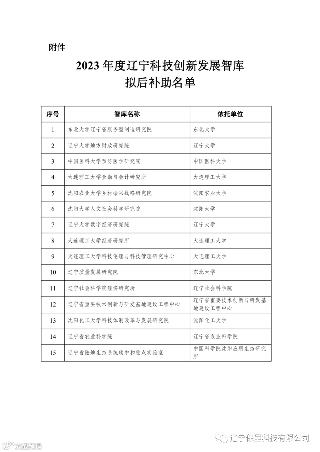 保呈快讯内容:关于《关于2023年度辽宁科技创新发展智库拟后补助名单公示》-内容分享