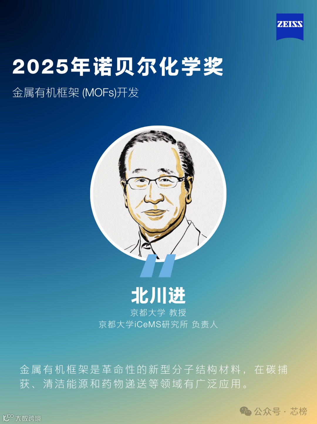 2025年诺贝尔化学奖于10月8日正式揭晓,北川进(SusumuKitagawa)、理查德·罗布森(Richard Robson)与奥马尔·M·亚吉(Omar M. Yaghi)三位科学家因共同开创[金属有机框架](Metal-Organic Frameworks, MOFs)的新型分子结构而获奖。