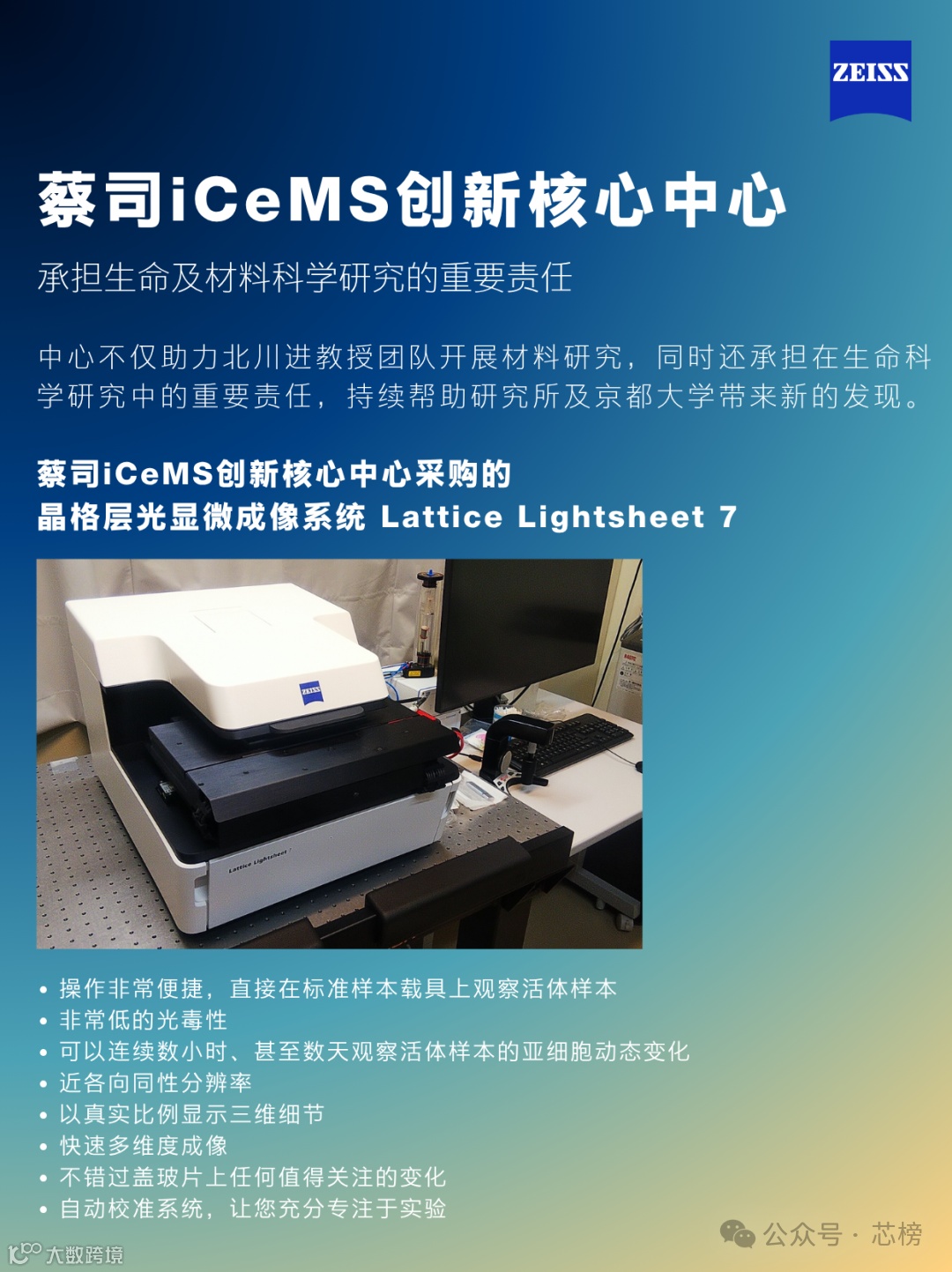 2019年,蔡司与京都大学 iCeMS 研究所 (Institute for Integrated Cell-Material Sciences) 联合创建了“蔡司iCeMS 创新核心中心 (ZEISS iCeMS Innovation Core) ”。