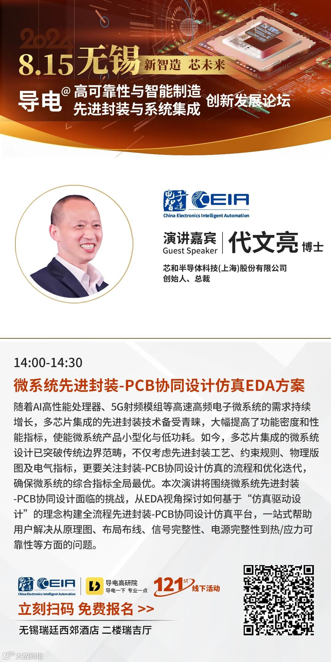 播分享真知,赋能中国智造,“新智造·芯未来”,8月15日第121届CEIA电子智造线下活动导电高可靠性与智能制造&先进封装与系统集成创新发展论坛即将在无锡隆重举办。11场精彩主题演讲,55家知名品牌展示,融合系统集成产业链,从微组装到先进封装。