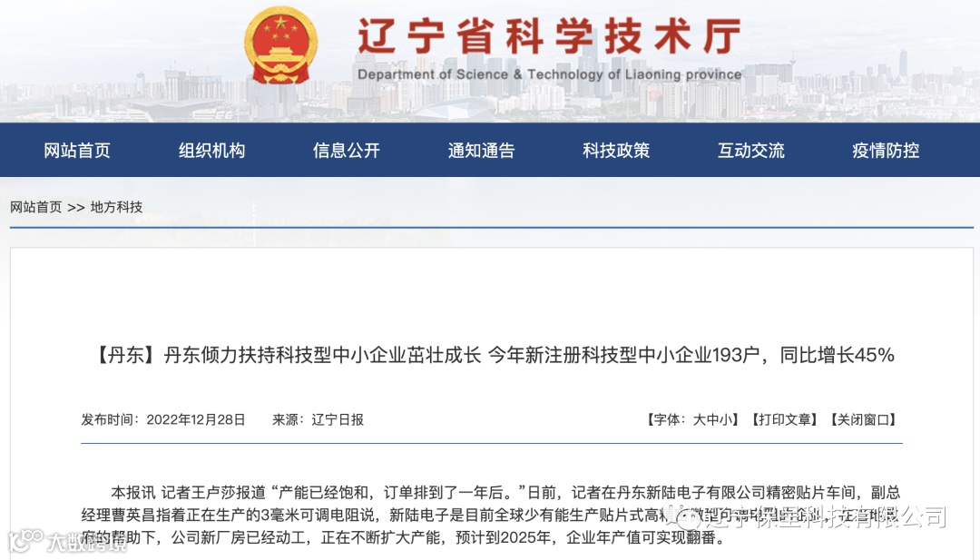 本期保呈快讯内容:关于《丹东市倾力扶持科技型中小企业茁壮成长 今年新注册科技型中小企业193户,同比增长45%》-内容分享