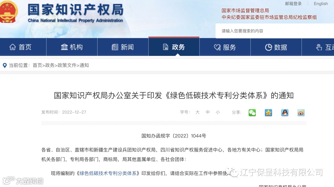 辽宁保呈科技有限公司本期保呈快讯内容:关于《国家知识产权局办公室关于印发《绿色低碳技术专利分类体系》的通知》-内容分享