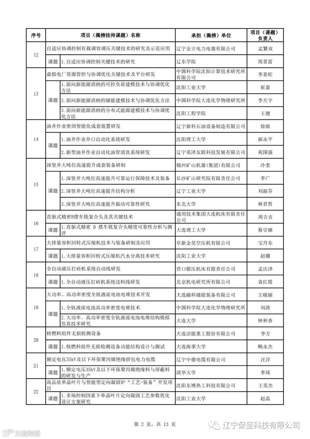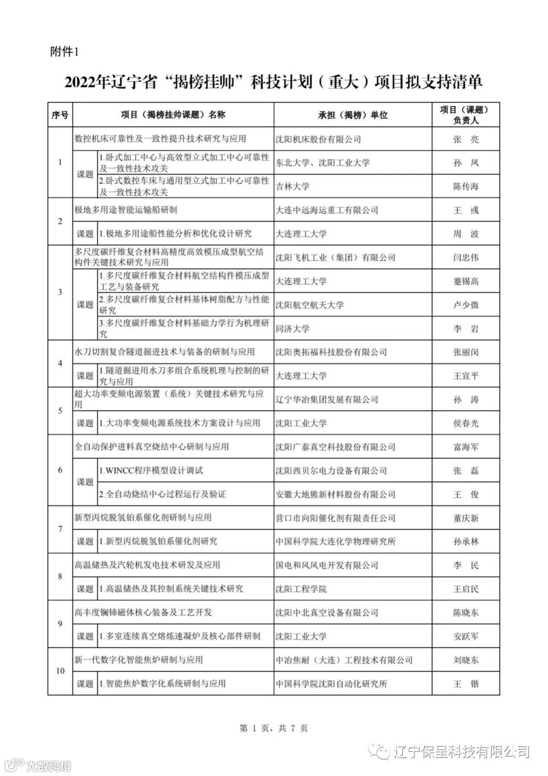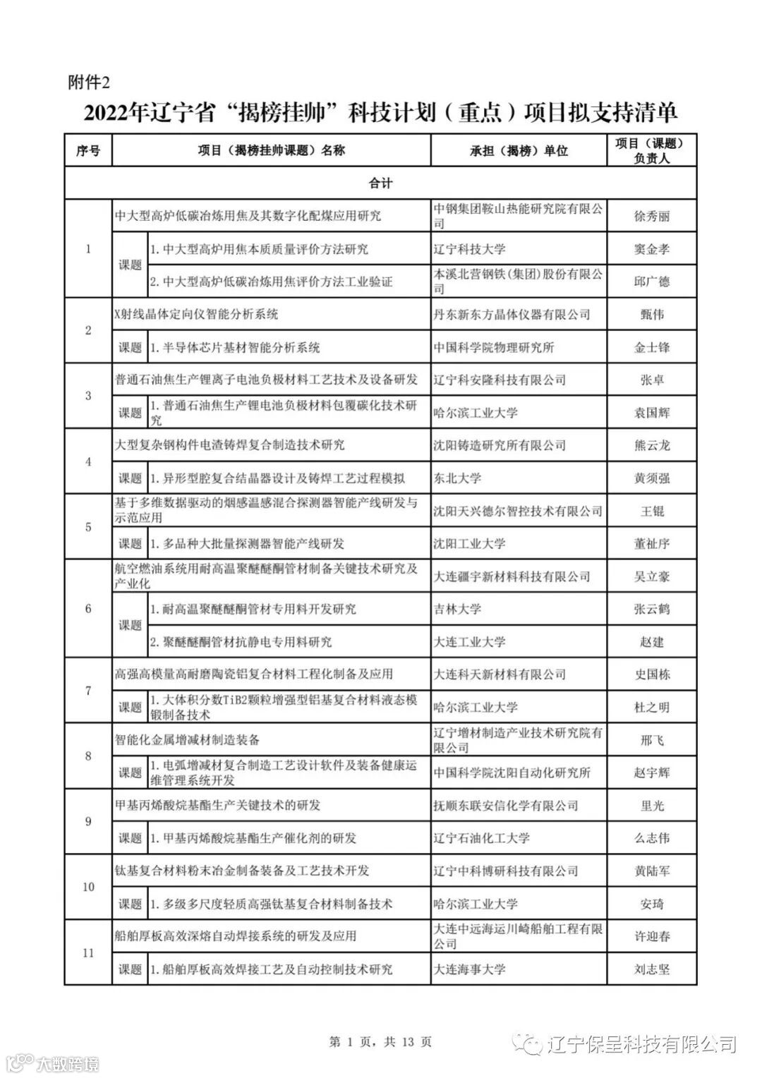 本期保呈快讯内容:关于《2022年辽宁省“揭榜挂帅”科技计划(重大/重点)项目拟支持清单》-内容分享