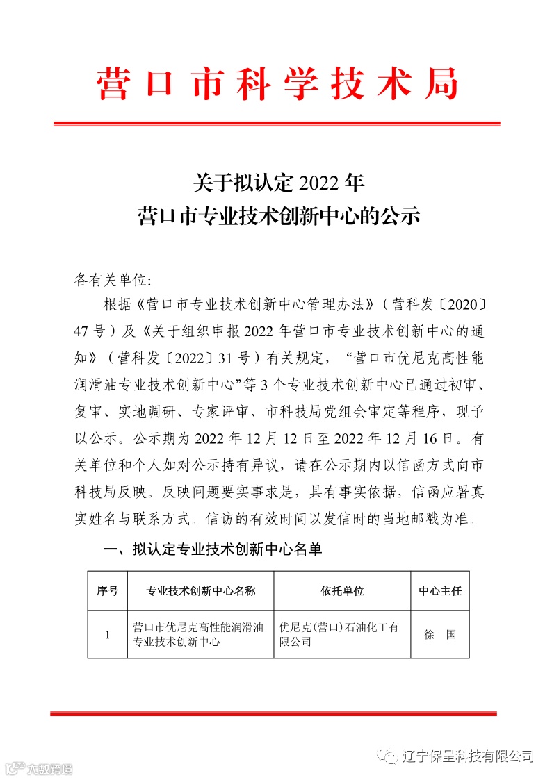 本期保呈快讯内容:关于《营口市关于拟认定2022年营口市专业技术创新中心的公示》-内容分享