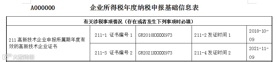 例如:甲企业2018年10月取得高新技术企业证书,有效期3年,2021年再次参加认定并于2021年11月取得新高新技术企业证书,纳税人在进行2021年度企业所得税汇算清缴纳税申报时,应将两个证书的“编号”及“发证时间”分别填入“211-1”“211-2”“211-3”“211-4”项目中。
