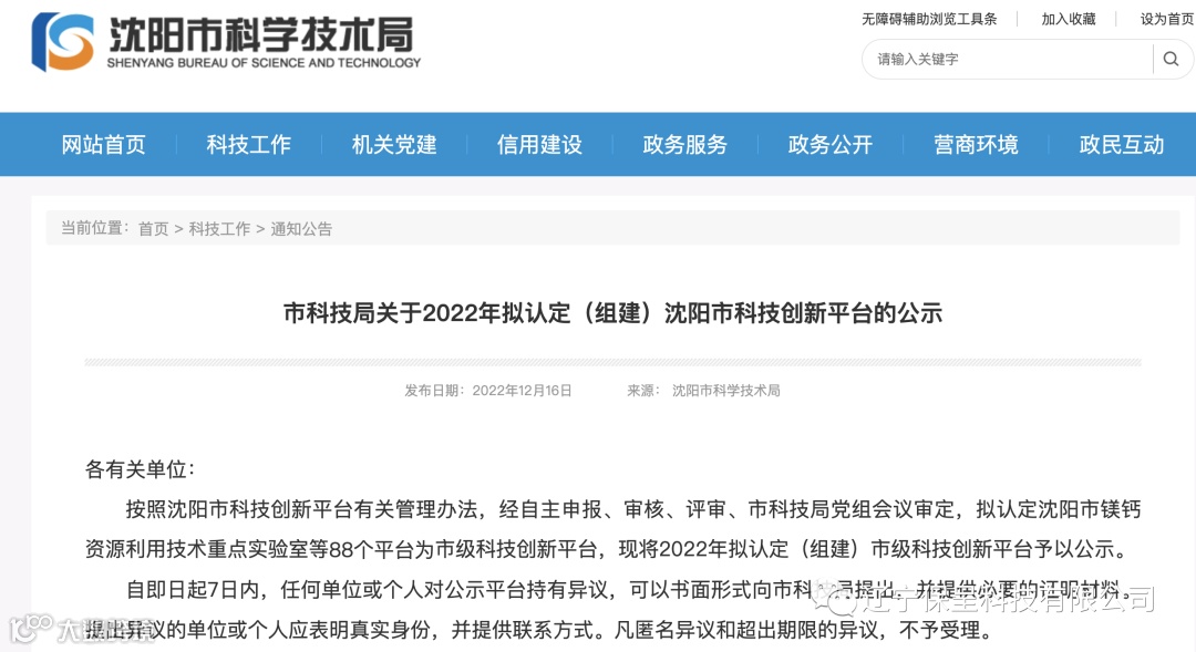 辽宁保呈科技有限公司本期保呈快讯内容:关于《沈阳市科技局关于2022年拟认定(组建)沈阳市科技创新平台的公示》-内容分享