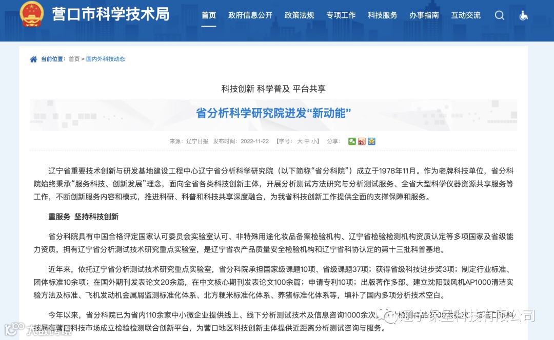 辽宁保呈科技有限公司本期保呈快讯内容:关于《省分析科学研究院迸发“新动能”——科技创新 科学普及 平台共享》-内容分享