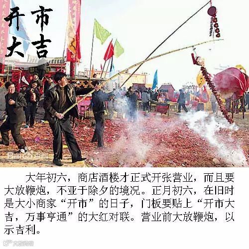 正月初六开市大吉,放鞭炮象征着今年的生意会红红火火,平平安安,大吉大利。这一天又称马日,在这一天要送穷,是汉族民间一种很有特色的岁时风俗。