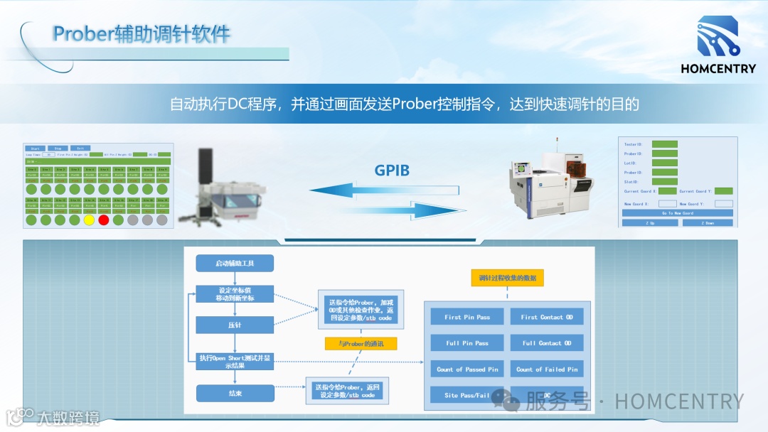 通过GPIB总线同步Prober微步进指令(步长精度可达1μm)与ATE DC参数采集,协同闭环控制,基于算法,实现3OD值智能判定。