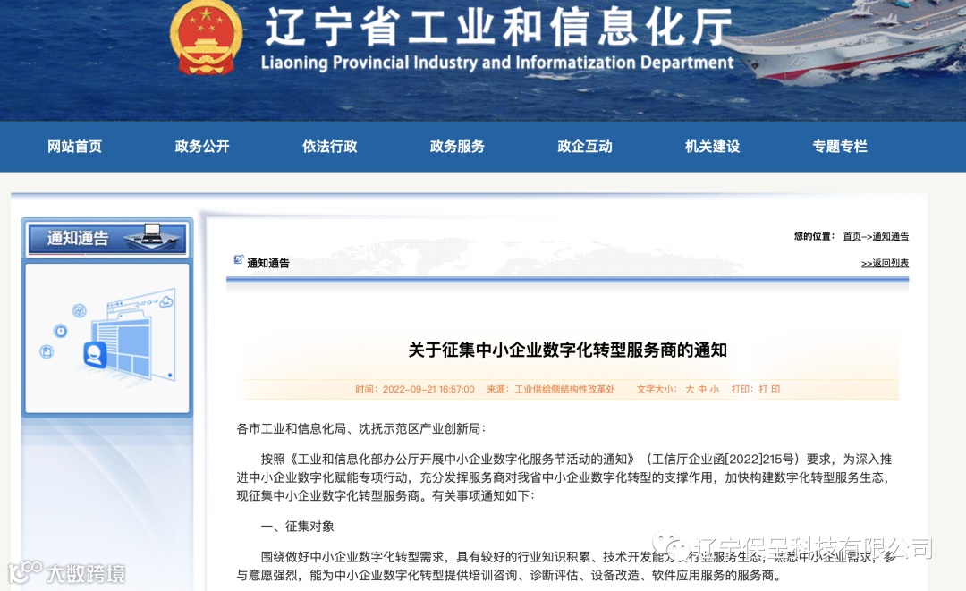 辽宁保呈科技有限公司本期保呈快讯内容:关于《关于征集中小企业数字化转型服务商的通知》-内容分享