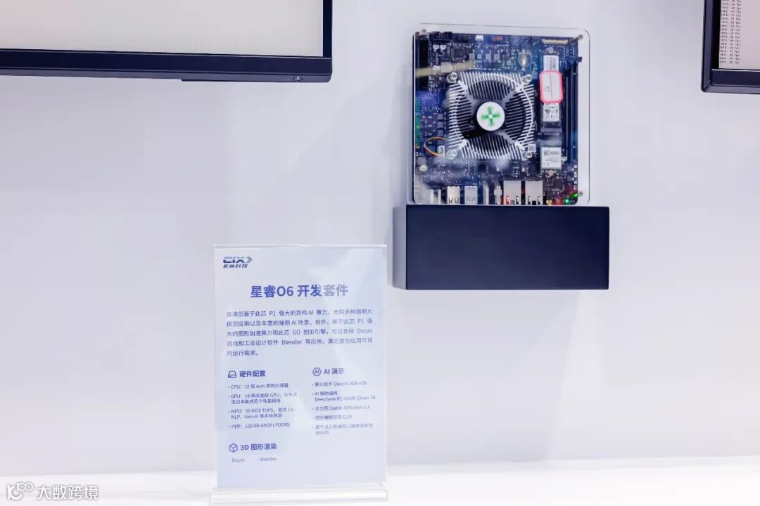 同属PC计算平台的星睿 O6 AI PC开发套件也吸引了大量关注。基于此芯 P1的异构AI算力,该套件支持多种端侧大模型应用及丰富的端侧AI场景,AI演示包含聊天助手、AI辅助编程等;同时,依托此芯 P1的图形加速算力和此芯 GO图形引擎,还能支持Doom游戏和工业设计软件Blender等桌面类3D图形应用,满足复杂应用环境需求。该套件由此芯科技联合安谋科技、瑞莎计算机联合推出,基于Armv9架构设计,已通过Arm SystemReady™认证,依托满足UEFI和ACPI标准规范的统一固件,实现多桌面操作系统开箱即用,可缩短客户产品上市周期。