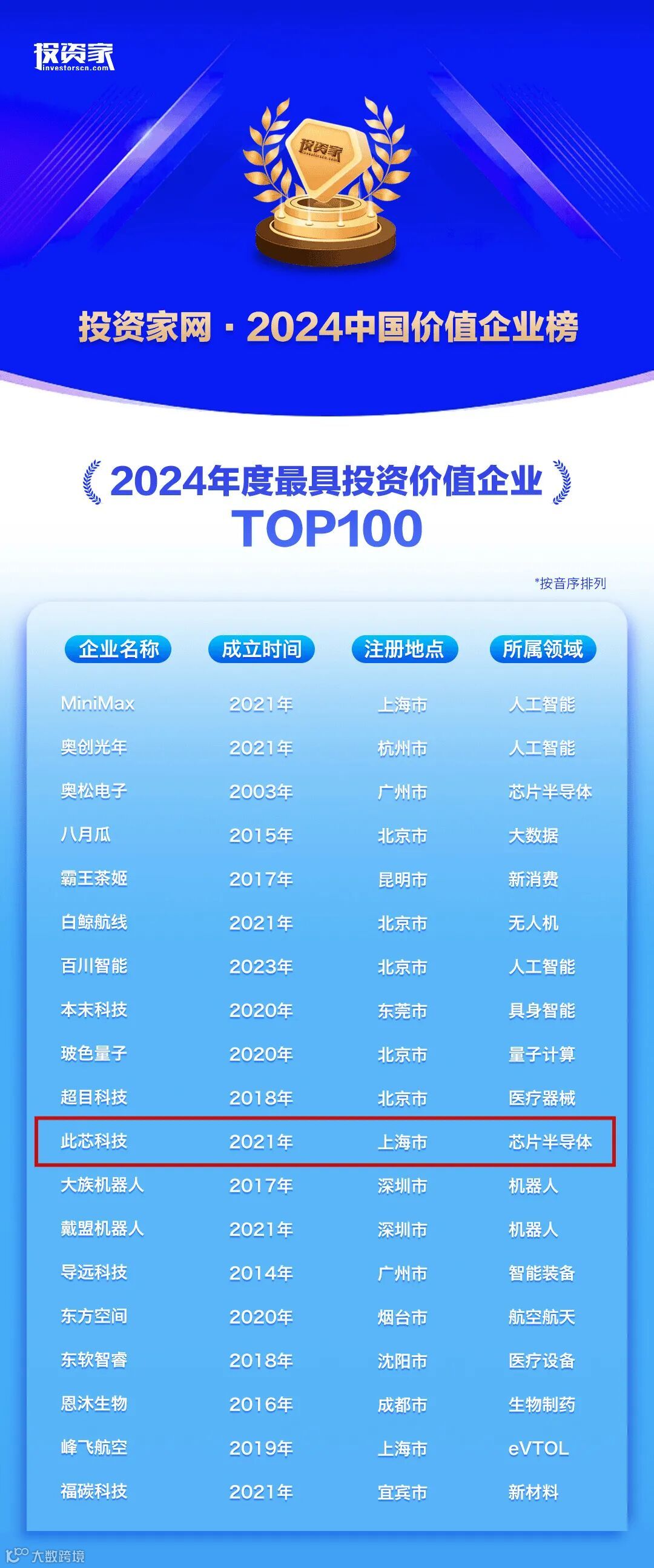 近日,投资家网旗下投资家研究院重磅发布“投资家网·2024中国价值企业榜”。本次榜单评选共分为“2024年度最具投资价值企业”、“2024年度创新企业”两大部分。投资家研究院从融资、技术、产品、团队以及影响力五大维度出发,结合投资家网WFin数据库,历时数月最终评选出符合上述条件的价值与创新企业。此芯科技凭借在智能计算领域的卓越表现,荣登“2024年度最具投资价值企业TOP100”榜单。