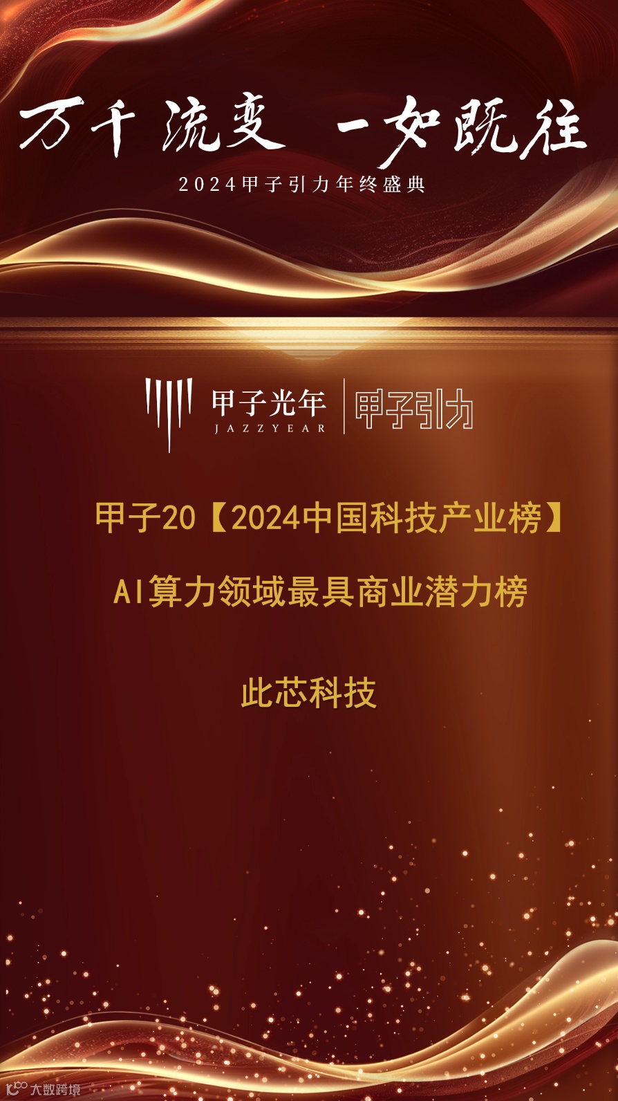 2024年12月11日,由甲子光年发起的「甲子20」、「光年20」、与「科技产业投资榜」三大榜单正式揭晓。其中,「甲子20」榜单旨在表彰2024年度在科技产业各细分赛道上拥有核心技术实力,并在商业化上取得卓越成绩的优秀科技企业。本次「甲子20」榜单涉及人工智能、先进制造、新能源与碳中和、智慧出行、科技服务、前沿科技等多个领域。通过对企业商业力、创新力、资本力、影响力等维度的综合评估,此芯科技连续第二年实力登榜中国AI算力领域最具商业潜力榜。