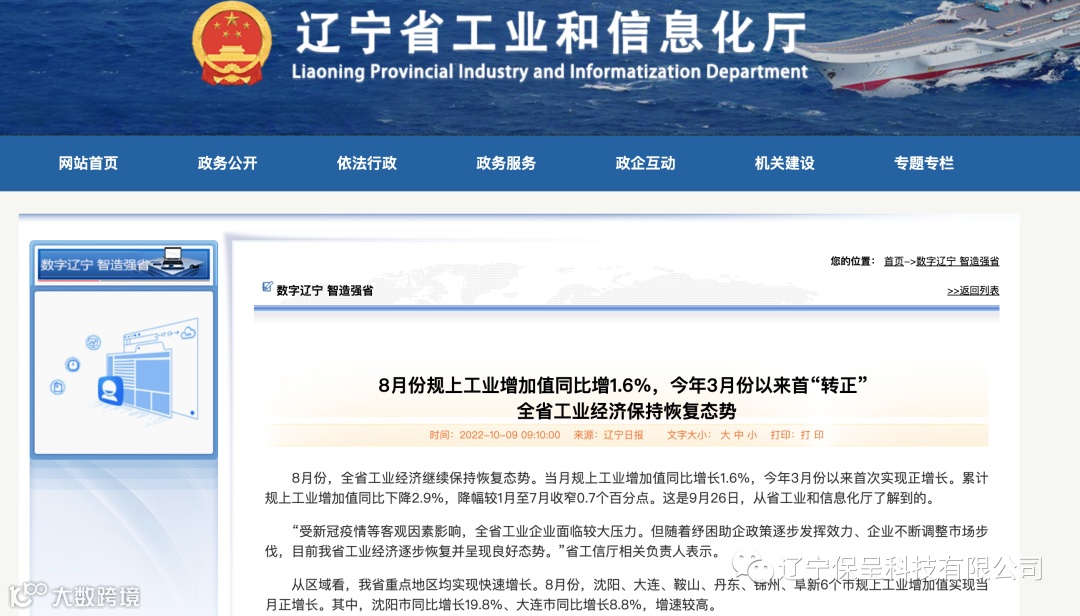 辽宁保呈科技有限公司本期保呈快讯内容:关于《8月份规上工业增加值同比增1.6%,今年3月份以来首“转正” 全省工业经济保持恢复态势》-内容分享