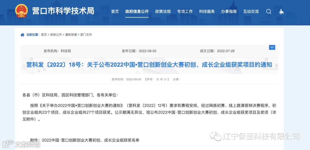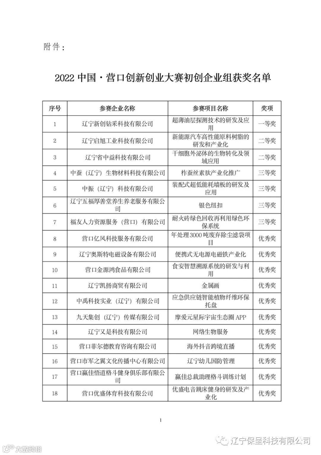 本期保呈快讯内容:营科发〔2022〕18号:关于《公布2022中国•营口创新创业大赛初创、成长企业组获奖项目的通知》-内容分享