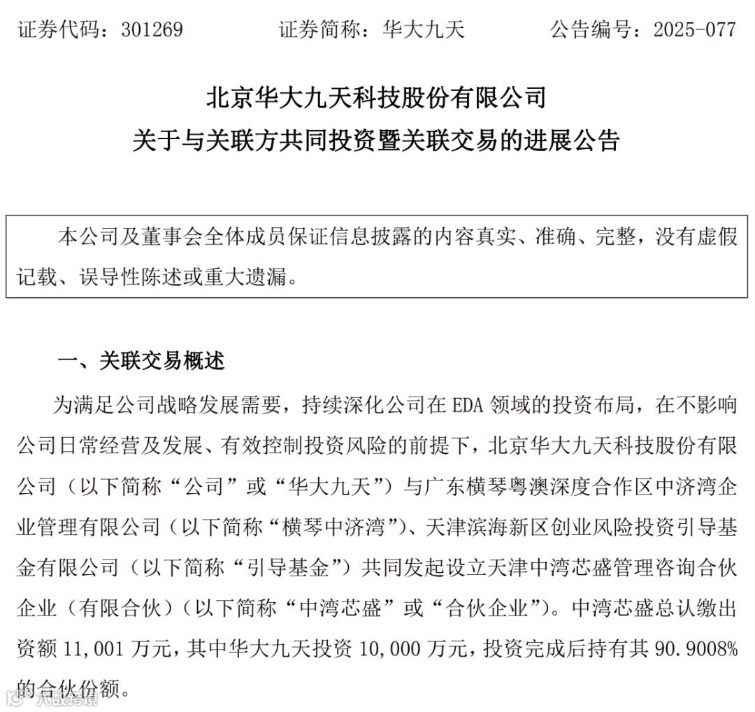 公司与横琴中济湾、引导基金共设天津中湾芯盛(总认缴11001万元),其中华大九天出资10000万元持股90.9008%。目前已签合伙协议、完成出资,中湾芯盛也获营业执照。