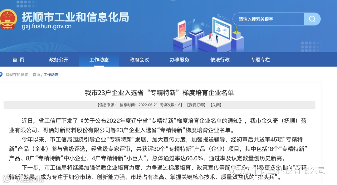 近日,省工信厅下发了《关于公布2022年度辽宁省“专精特新”梯度培育企业名单的通知》,抚顺市金久奇(抚顺)药业有限公司、哥俩好新材料股份有限公司等23户企业入选省“专精特新”梯度培育企业名单。