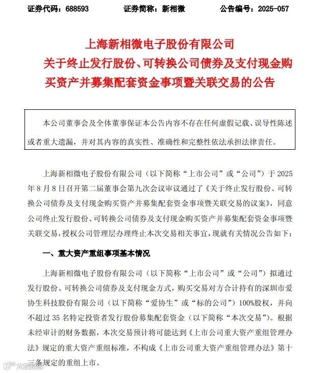 8月9日,新相微发布公告,宣布于8月8日审议通过决议,终止发行股份、可转换公司债券及支付现金购买资产并募集配套资金事项暨关联交易 ,授权管理层处理相关终止事宜。此前,新相微计划通过发行股份、可转债及支付现金的形式,收购爱协生100%股权,并向不超35名特定投资者募资。