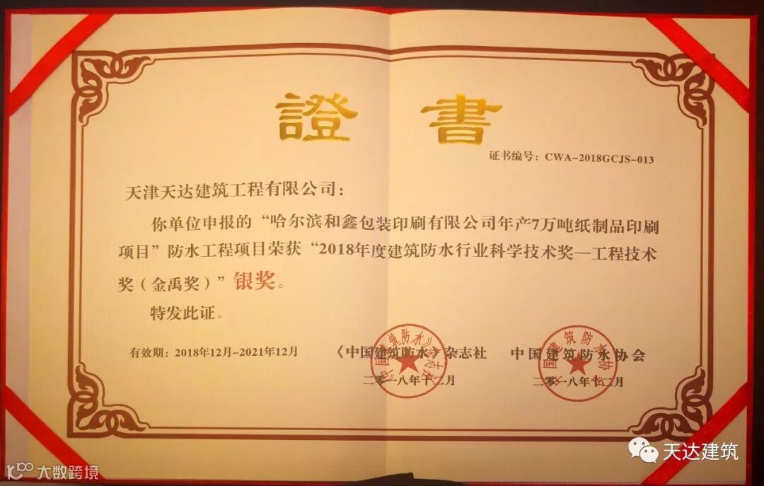 2018年12月18日,在成都召开的2018年建筑防水行业年会上,中国建筑防水协会公布了“2018年度建筑防水行业科学技术奖——工程技术奖(金禹奖)”的评选结果,并进行了表彰。天津天达建筑工程有限公司承建的——哈尔滨和鑫包装印刷有限公司年产7万吨纸制品印刷项目,从众多项目中脱颖而出,荣获“2018年度建筑防水行业科学技术奖——工程技术奖(金禹奖)”。