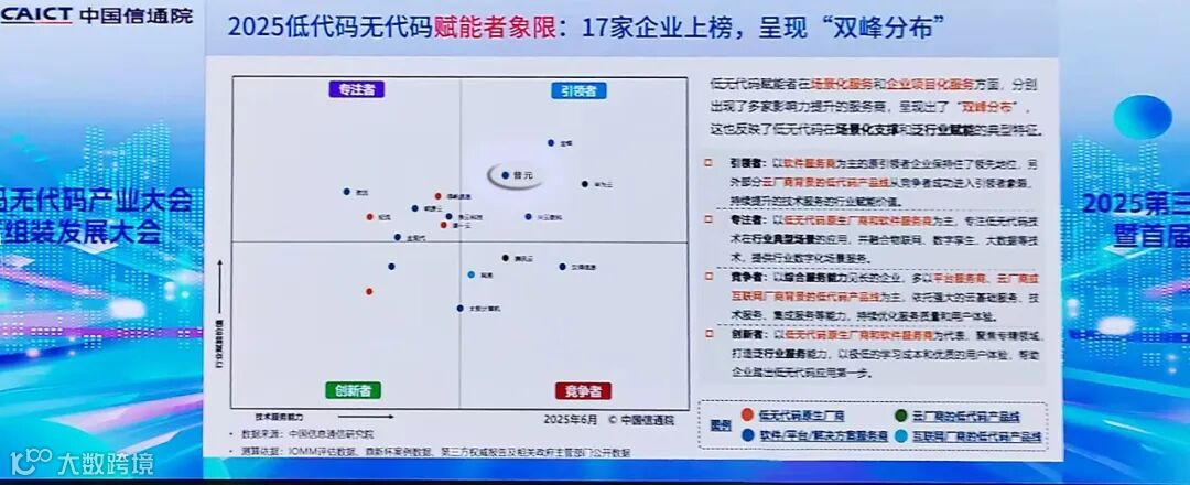 6月25日,由中国通信标准化协会主办、中国信息通信研究院承办的“2025第三届低代码无代码产业大会暨首届企业智能组装发展大会”在北京召开,发布《2025低代码&无代码产业双象限》等研究成果。普元信息技术股份有限公司(科创板股票代码:688118)依托低代码技术服务能力与行业赋能价值,再度获评低代码产业赋能者象限“引领者”,与华为云等头部企业共居行业第一梯队。