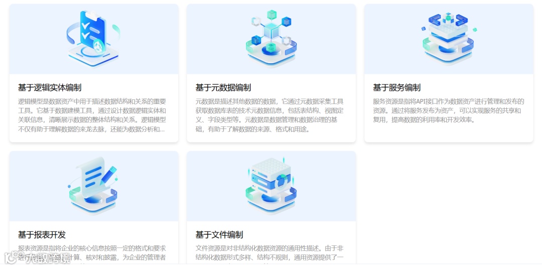 可基于逻辑实体、元数据、服务、报表、文件等方式快速完成资产的编目,设置分类信息、特征属性、安全等级、标签等内容,资产发布后形成统一的数据资产门户,完成资产的申请、检索等。