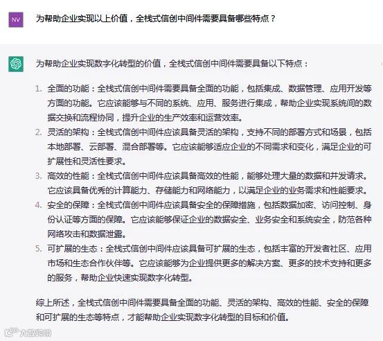 ChatGPT对全栈式信创中间件的分析面面俱到,从功能、架构、性能、安全到生态的描述瞄定普元产品优势而来~我们不由得又问了以下问题: