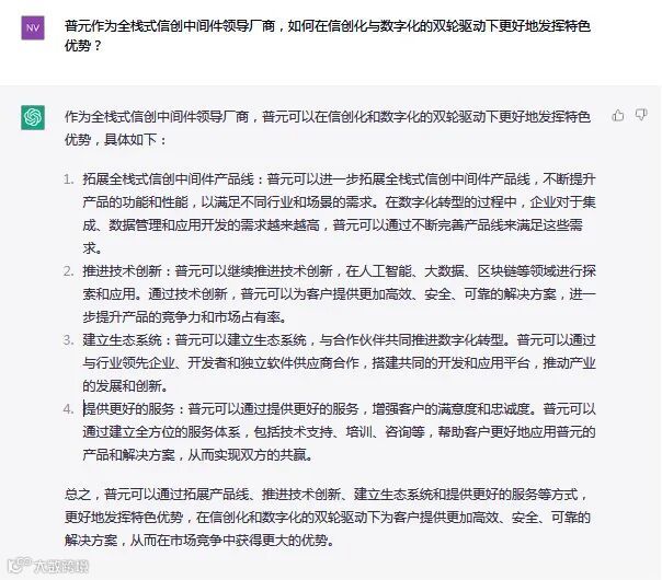 ChatGPT从产品、技术、实践、性能多方面肯定了普元,它“自我思考”后给到的建议也和普元20年来坚持的路线类似。