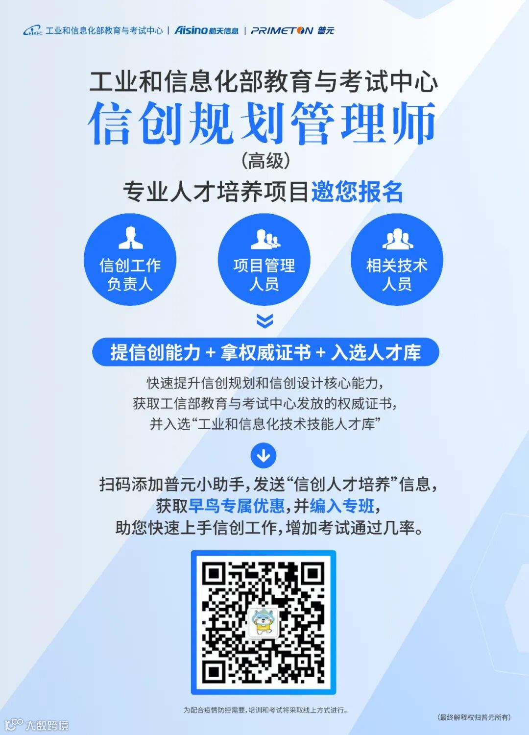 作为全栈信创中间件领导厂商,普元邀请您加入信创规划管理师(高级)专业人才培养项目,扫码领取早鸟专属优惠与专班特权!