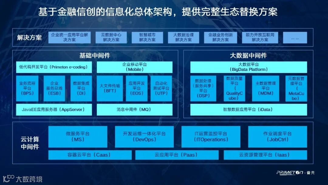 目前,普元应用服务器PAS等多项产品进入了央采名单、金融行业等目录,能够基于金融信创的信息化总体架构,与芯片、服务器、操作系统、数据库等主流厂商在内的全栈式信创生态体系进行无缝对接和支撑,支持金融行业应用较多的云原生环境。同时,普元融合全栈式信创中间件产品及服务,还可为客户提供企业统一应用平台、云数据中心、大数据治理、金融业务创新、能力开放互联网等系列解决方案,帮助客户进行完整生态的信创替换与升级,推进科技和业务的进一步融合,支撑金融数字化转型。