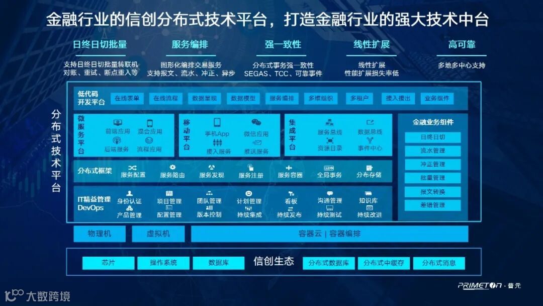 其中,分布式改造基于信创分布式技术平台提供,融合了普元深耕金融行业近二十年的实践经验,以及应用开发平台、DevOps、微服务平台等全栈式信创中间件产品,不仅帮助客户加速云应用交付、助力构建API生态、规范化云应用建设、提升IT资产复用,还提供了众多具备金融行业特性的能力点,包括像银行经常用到的日终日切批量、典型的服务编排,以及对事务一致性要求比较高的分布式事务等,帮助客户实现金融关键能力的支撑,深化金融信创背景下的科技和业务融合,促进金融数字化转型发展。