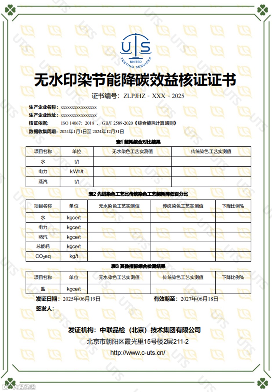 涵盖核证基础信息、依据标准与方法,详述数据采集及实地核查过程,量化对比无水/少水印染与传统工艺的能耗、碳排放及辅助环保指标,明确核证结论并附支撑材料。
