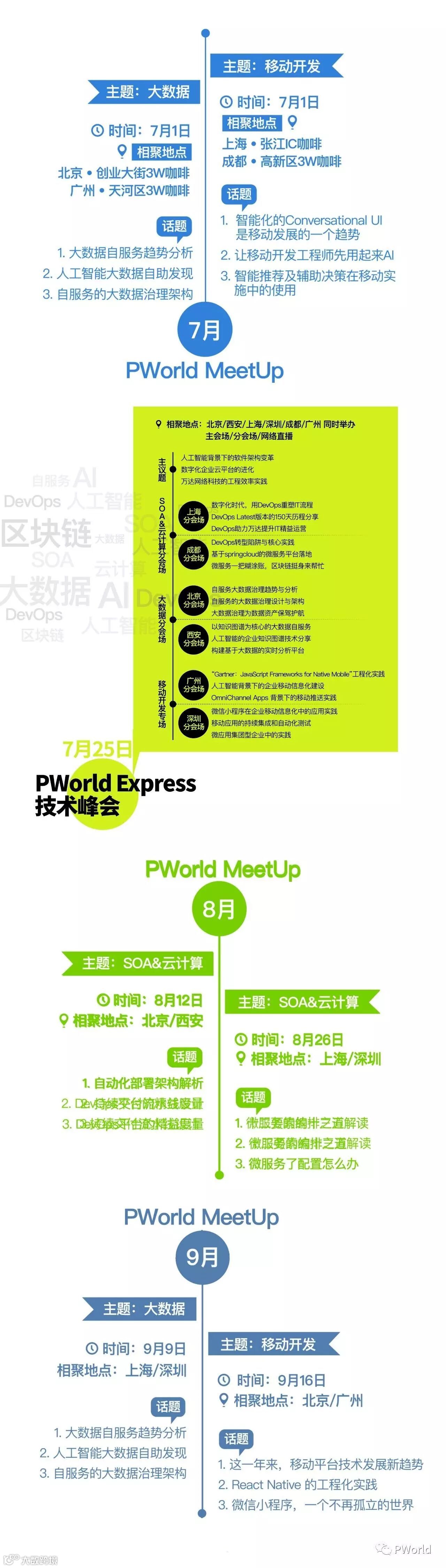 PWorld 2017将走过北京、上海、广州、西安、深圳、成都六座城市,PWorld MeetUp主题沙龙将分别举办12场主题沙龙;PWorld Express技术峰会将于7月25日在六地同时召开。