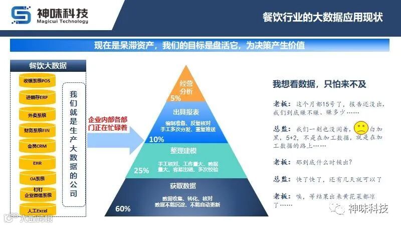 只要一个公司所管辖的门店超过5家以上,对数据决策支持的依赖性就会显著提高;大多数的中小餐饮数据的整合瓶颈主要在两个方面: