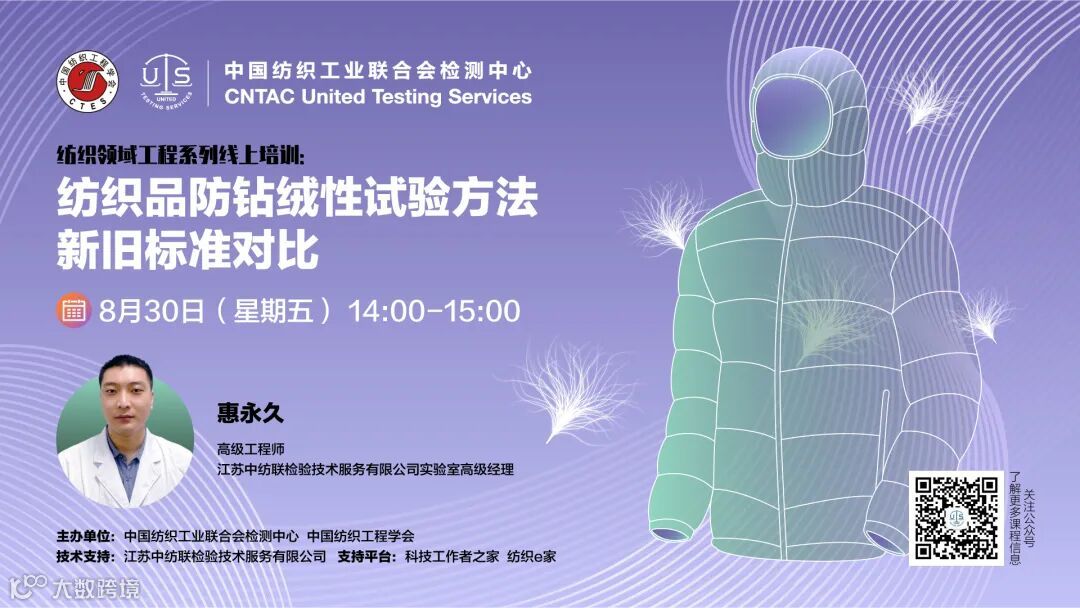 纺织领域工程系列线上培训——《纺织品防钻绒性试验方法新旧标准对比》于8月30日结束,千余人次在线观看。